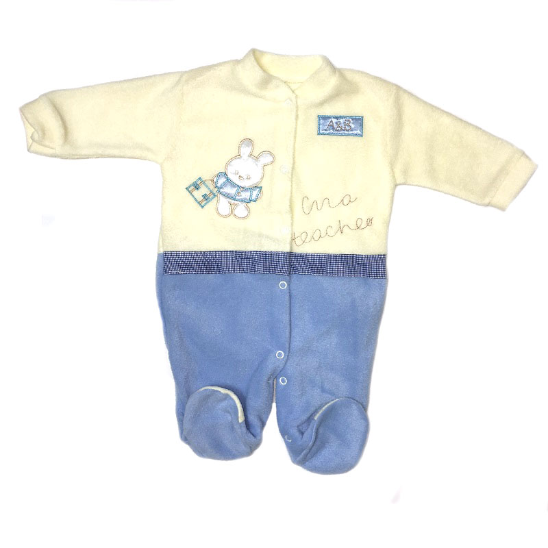 Комбинезон из флиса без воротничка, с закрытыми ножками, с длинными рукавами на манжете, спереди и между ножек на кнопочках, спереди украшен аппликацией и вышивкой.