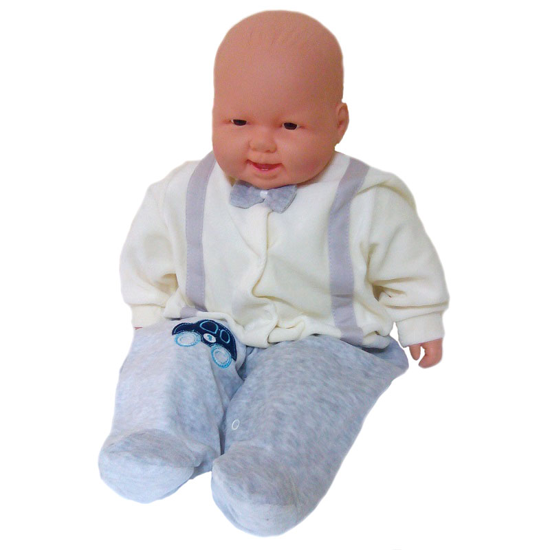 Комбинезон для мальчиков из велюра, с закрытыми ножками, с длинным рукавом на манжете, без воротничка, спереди и между ножек на кнопочках. Украшен имитацией подтяжек и пришитой "бабочкой". Верх молочного цвета, штанишки серого цвета.